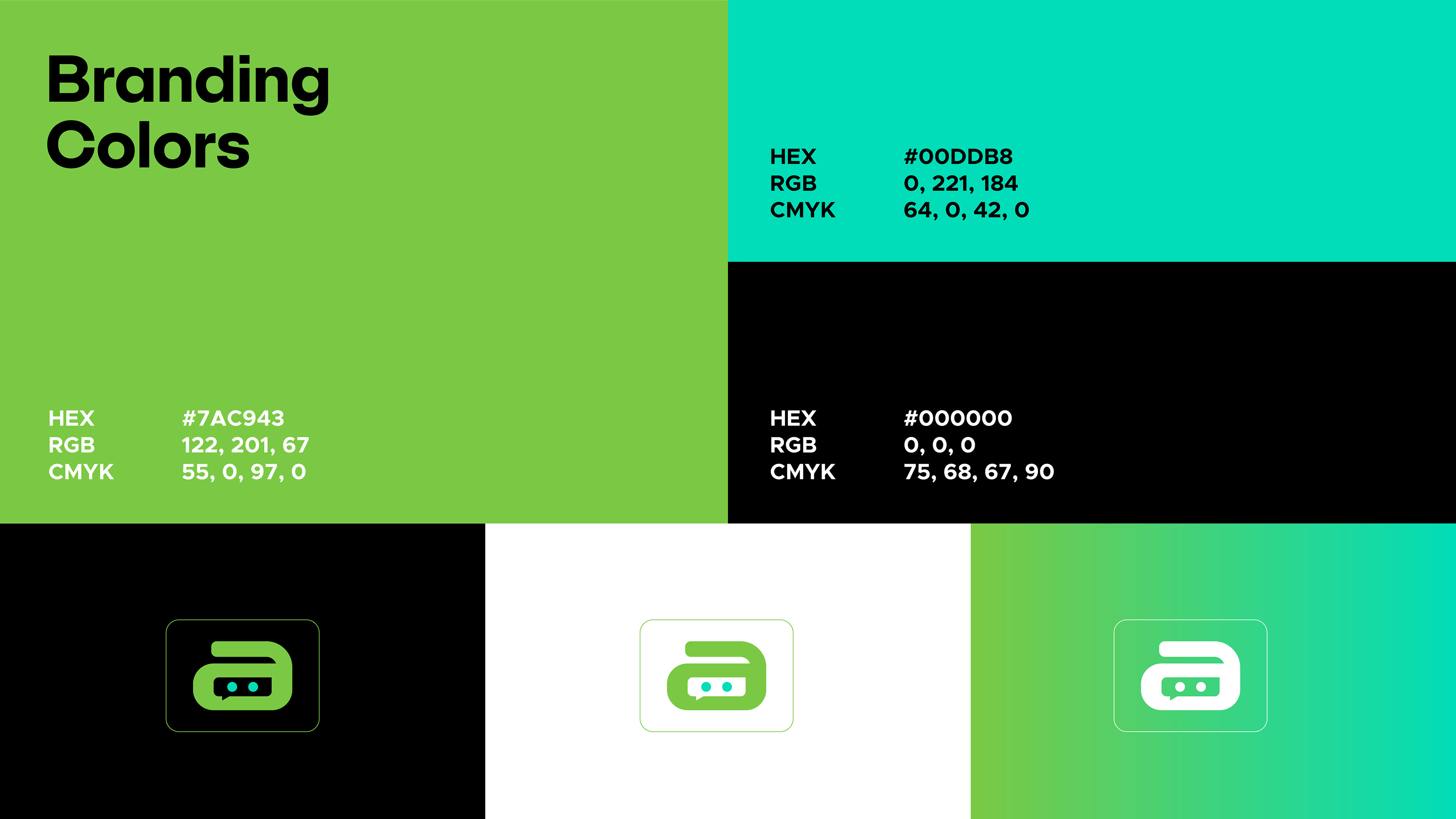 Using a futuristic typeface and a fresh green–aqua palette, the identity feels tech-forward, clean, and instantly recognizable across digital platforms. The icon version ensures perfect clarity in app icons, chat bubbles, and small spaces.